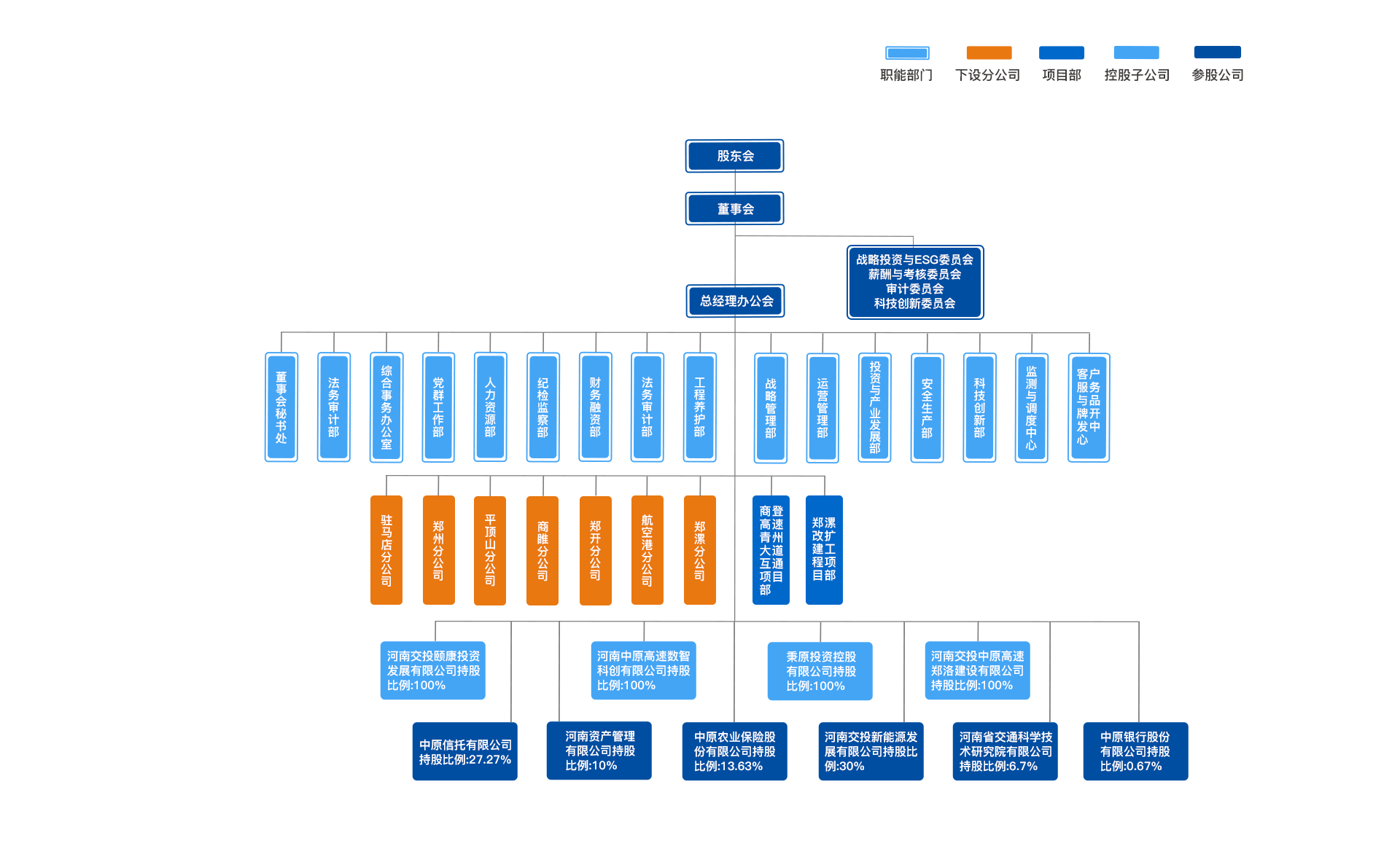 在主业稳健的基础上,公司大力发展多元化项目,目前已形成了以高速公路经营为主,股权债权投资、基金、房地产、信托、保险、银行、路域经济开发为辅的多元化发展战略格局。目前拥有全资子公司4家,分别为:秉原投资控股有限公司、河南交投中原高速郑洛建设有限公司、河南交投颐康投资发展有限公司、河南中原高速数智科创有限公司。参股企业6家,分别为:河南交投新能源发展有限公司、中原信托有限公司、中原农业保险股份有限公司、河南资产管理有限公司、河南省交通科学技术研究院有限公司、中原银行股份有限公司。